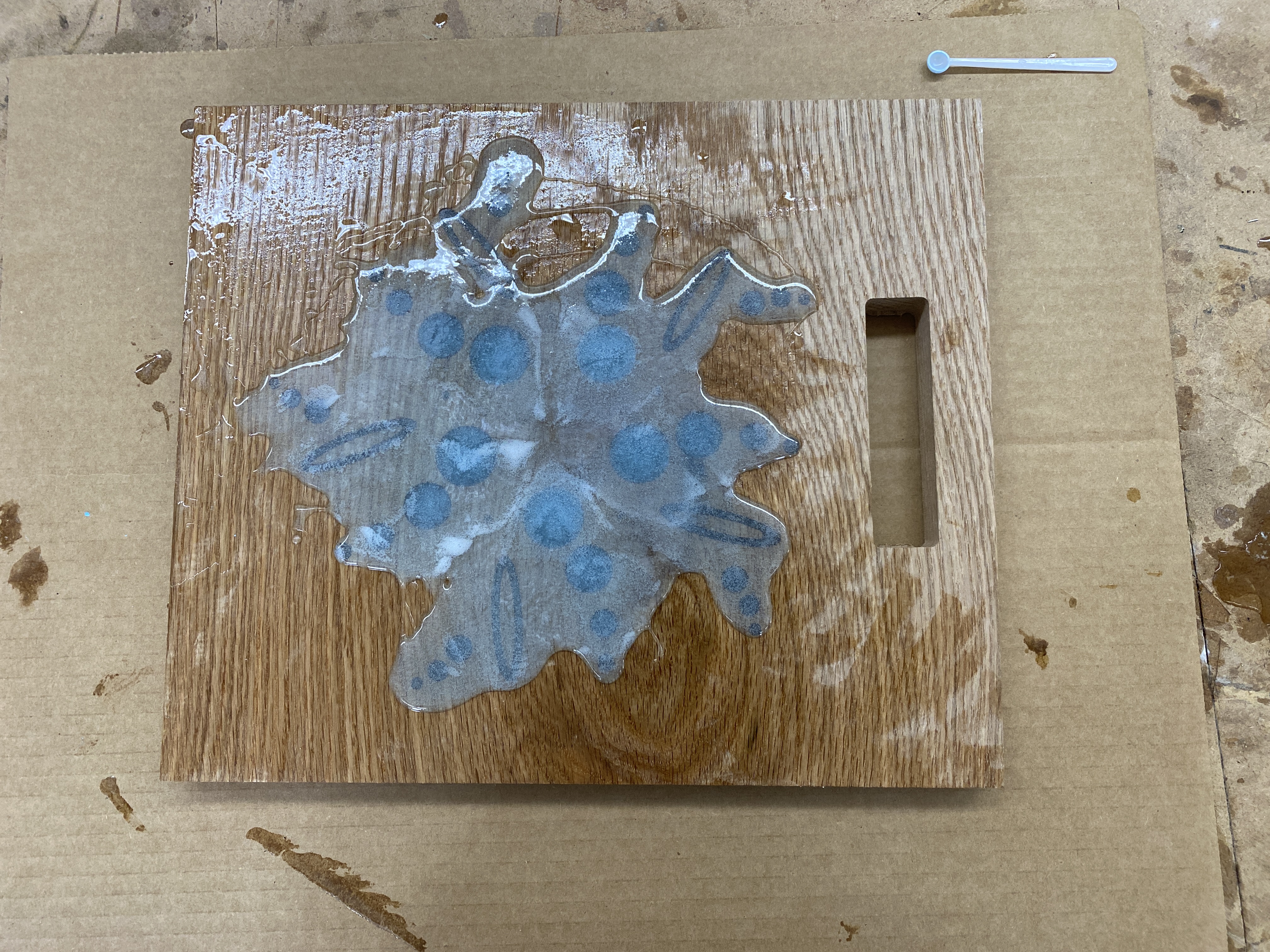Now that the board itself is ready, I need to apply resin to all of the indentations that I created. I first poured resin over the entire board to ensure that it got into every cut.