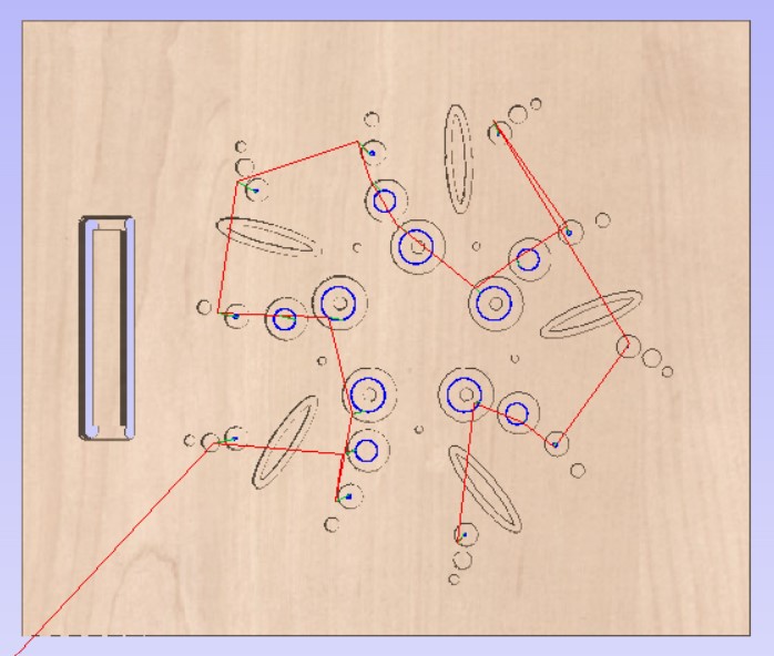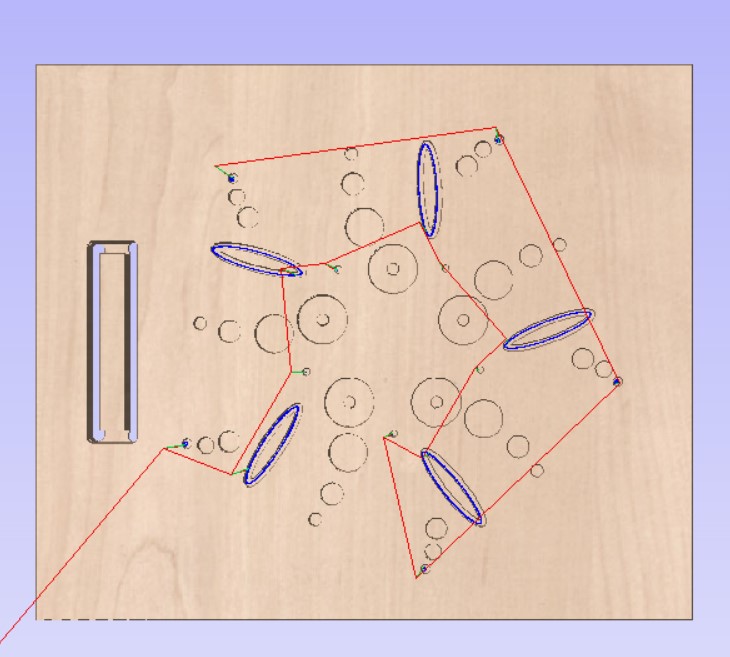 The "big" toolpath is essentially responsible for everything that isn't too small for the 3/8" bit. This toolpath cuts the first 3 circles on each 4-circle array, and cuts the first circle on each 3-circle array.