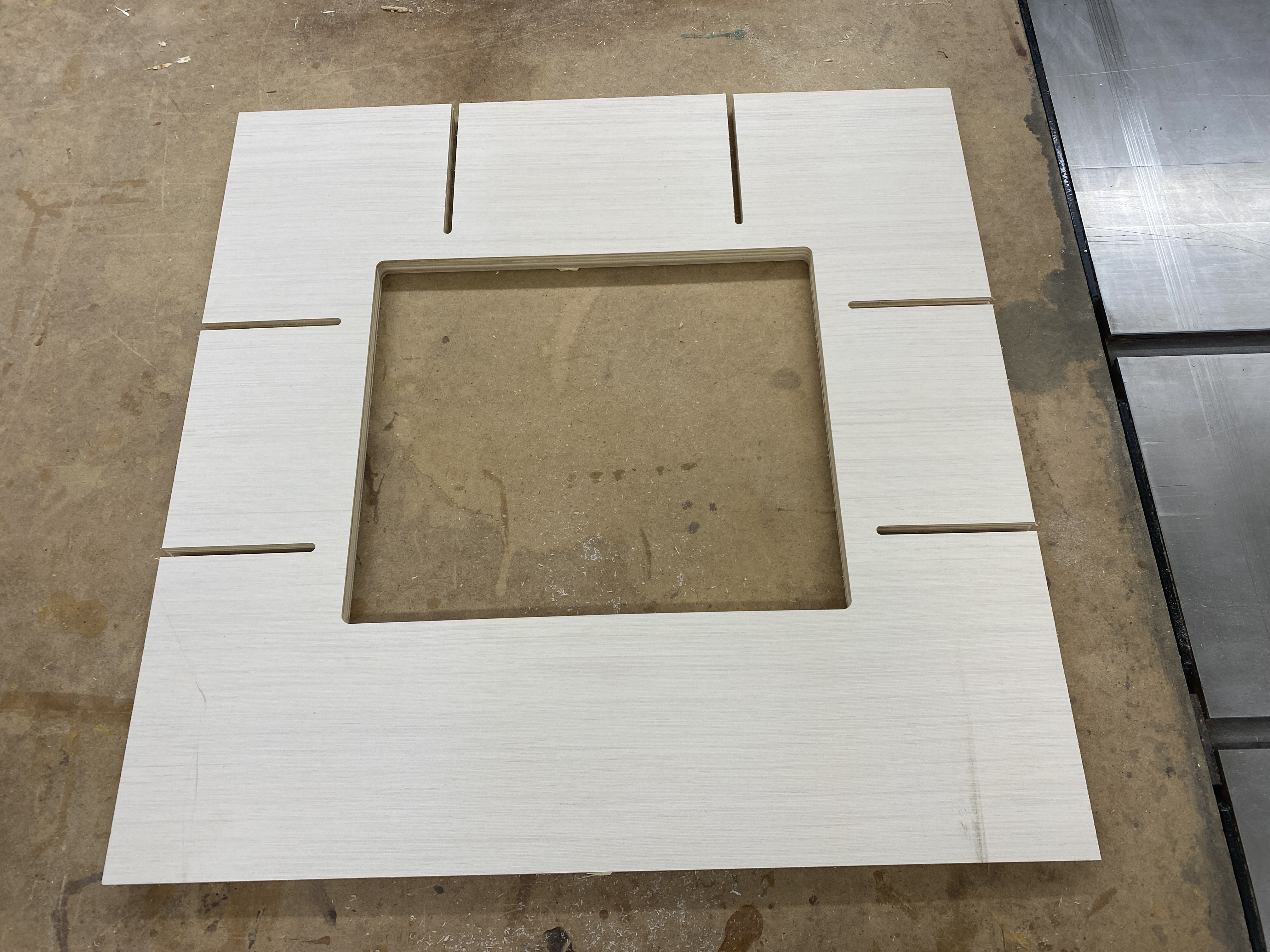 I then de-bradded the larger wood piece and took off the jig. The internal rectangle cutout has retained the correct dimensions to fit in a 13 inch by 11 inch cutting board, and each of the outer inlets are the correct thickness.