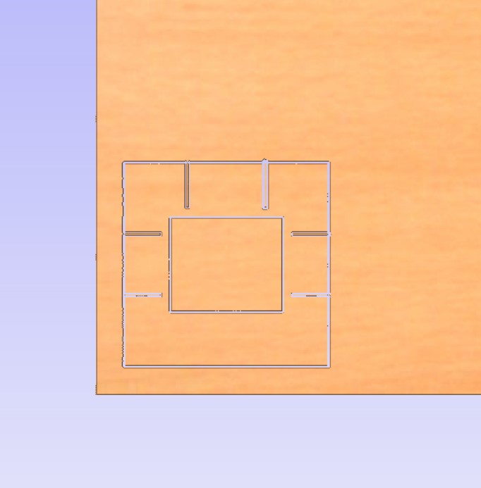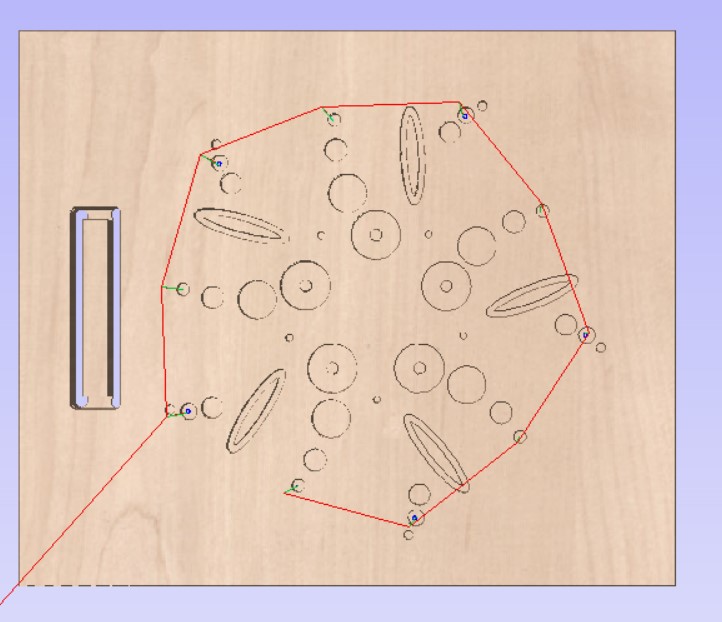 From there, I imported it into Aspire and began creating the toolpaths. Specifically, the internal rectangle would use the "Inside" cutting setting, as I needed to preserve the exact dimensions of the rectangular hole to fit the cutting board wood into. The outside edge and the six inlets all used the "Outside" cutting setting.